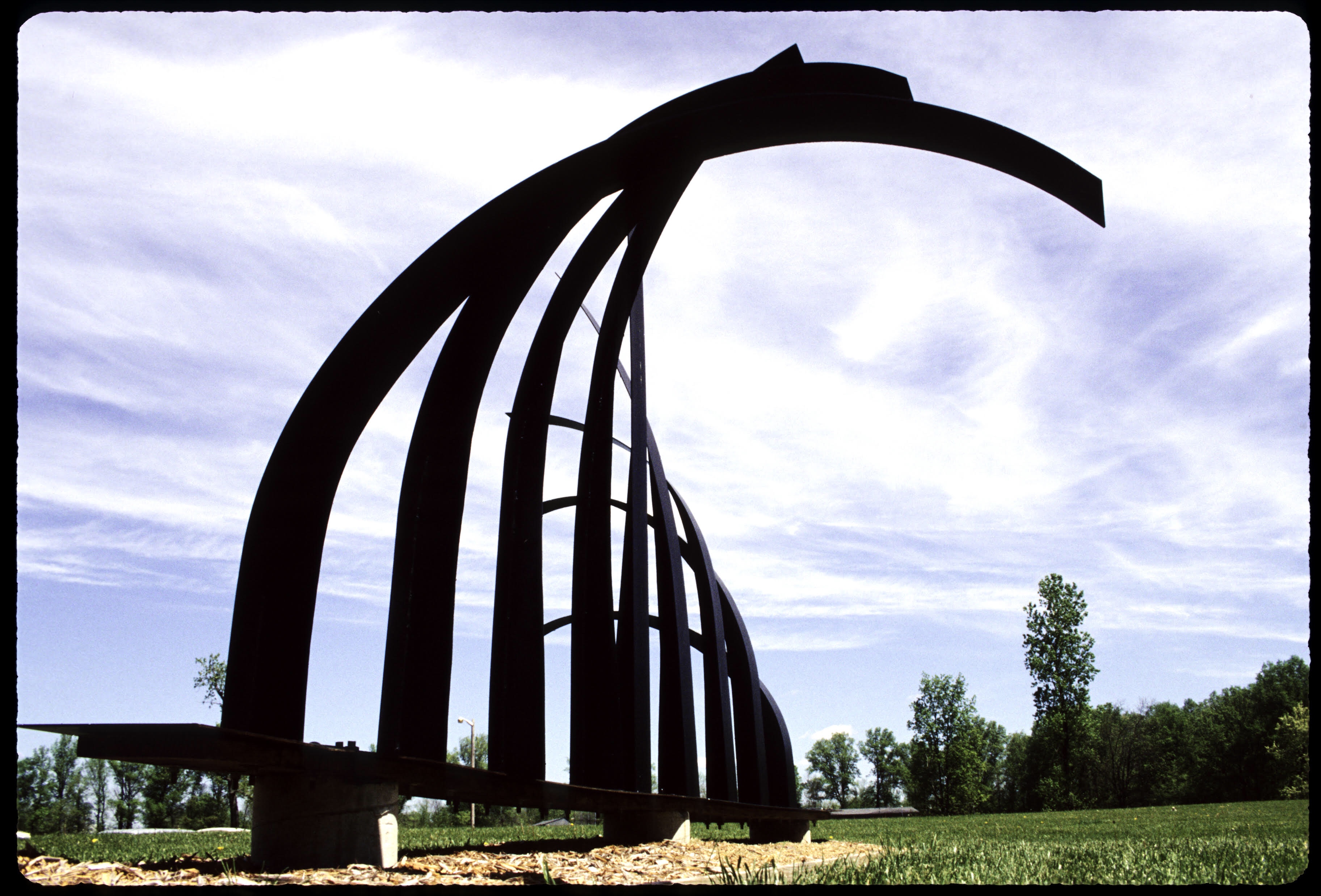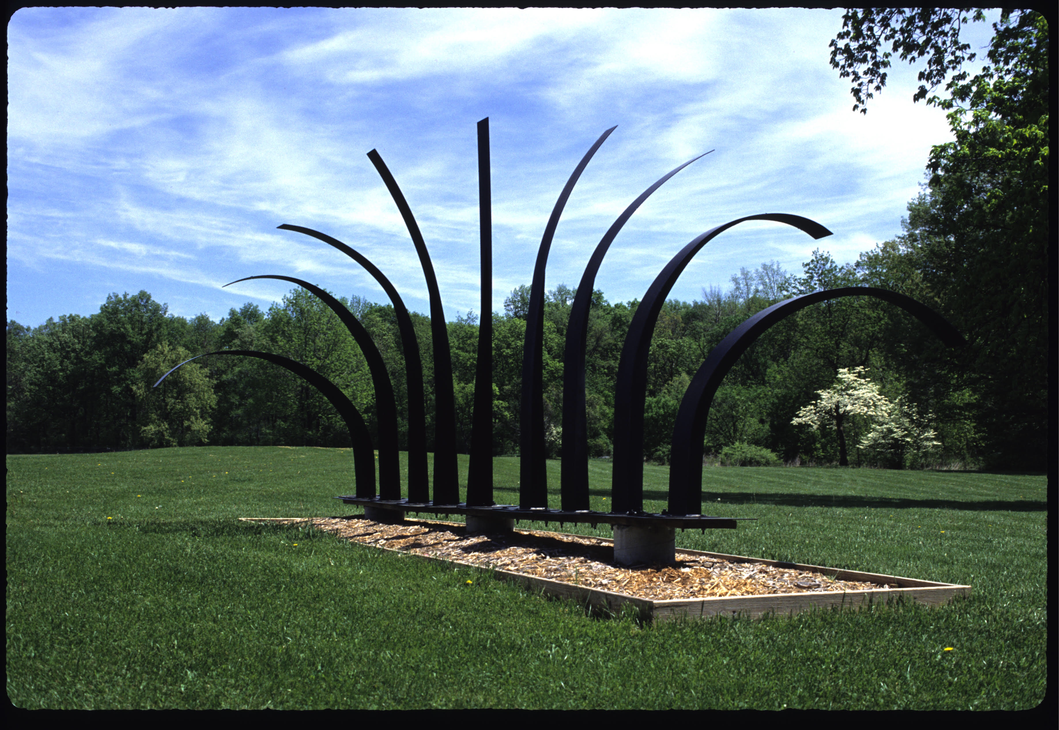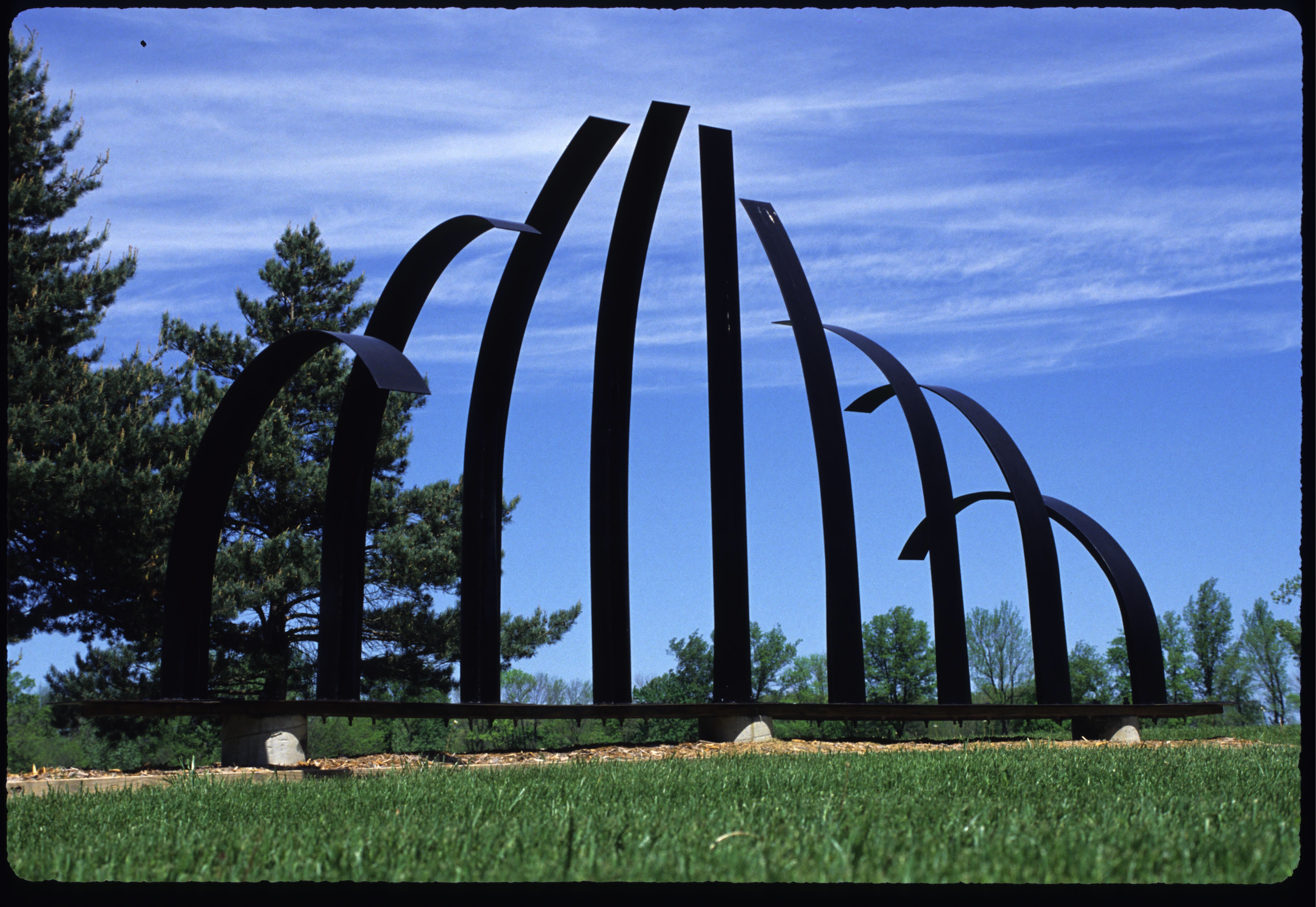 “No. 9” is a sculpture that I created in 1989 for my Senior Project at The Columbus Academy, my high school alma mater. Originally, “No. 9″ was made with nine eight foot by eight inch units of 1/8” mild steel. Each unit was bolted onto a base of mild steel, pressure treated wood and three columns of Anderson Concrete. The sculpture was designed so that it could be taken apart and reassembled like a giant Erector Set. The original version of “No. 9” was eighteen feet long and eight feet high. This project would not have happened without the support from my teachers David Block and Cindy Wilson at CA. “No. 9” was fabricated with the guidance of Ken Valimaki at Fort Hayes High School.
